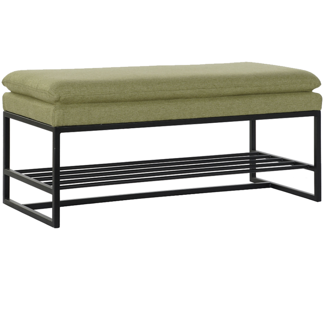 Banco de líneas modernas en metal negro y tapizado en verde oliva. Con bandeja a modo de zapatero. De medidas, recogidas.