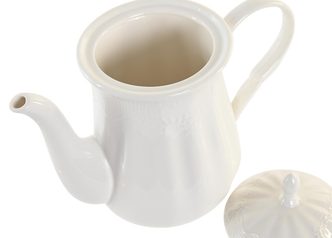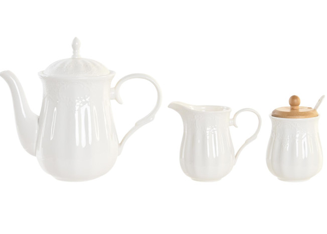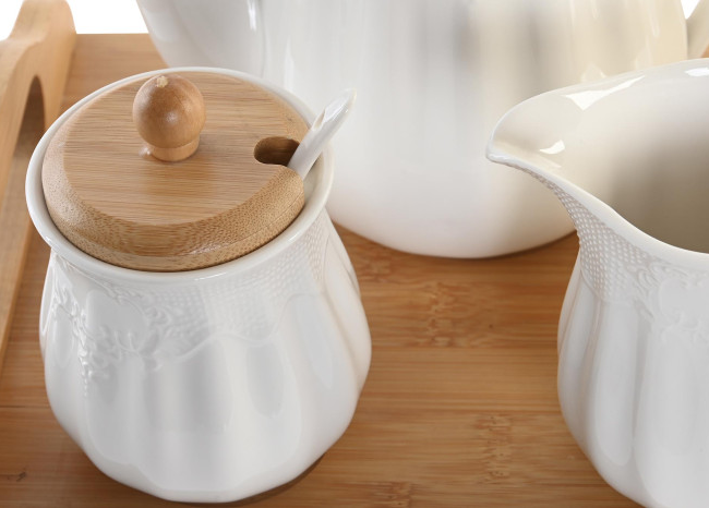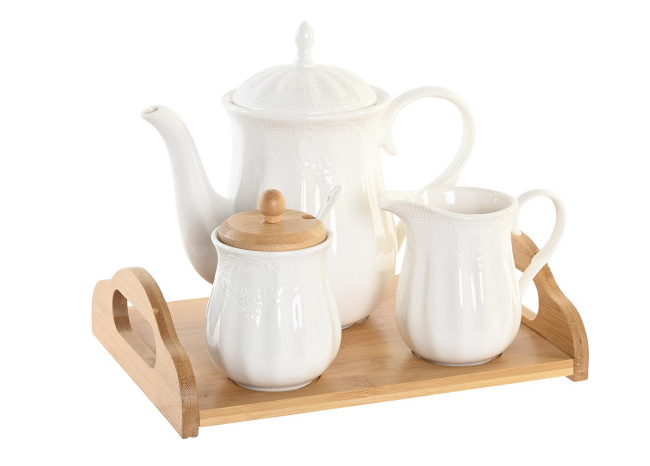 Juego de tetera, azucarero y lechera en porcelana blanca con bandeja de madera de bambú.