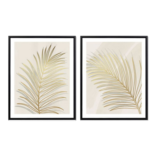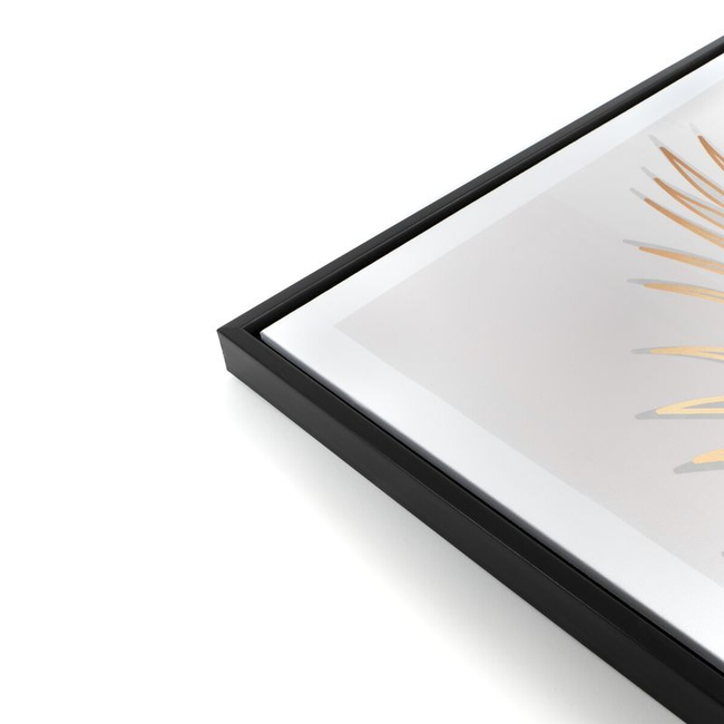 Cuadro decorativo enmarcado en oscuro con hojas en tonos dorados. Pura delicadeza
