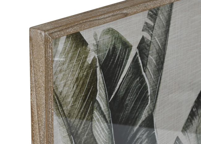 Cuadro enmarcado en madera de abeto envejecido con lienzo de palmeras en verde antiguo, y frente de cristal
