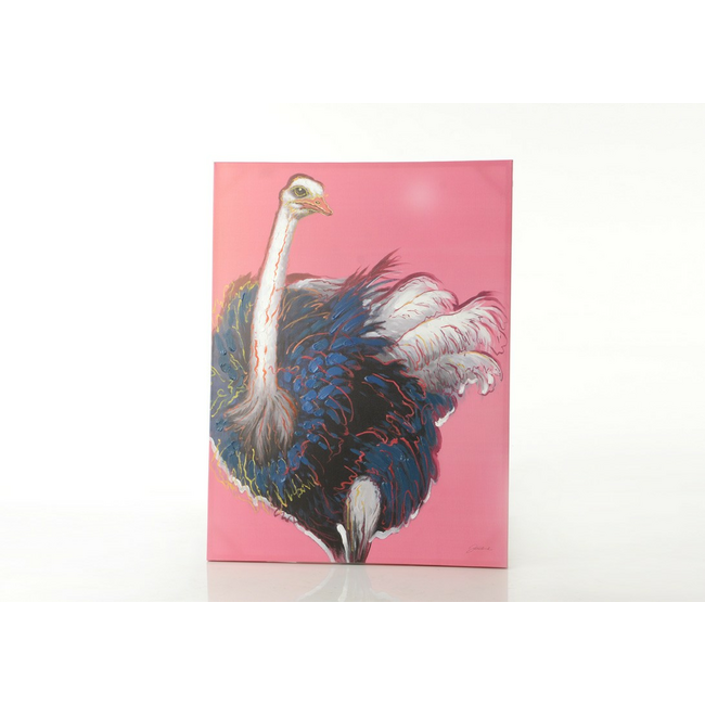 Lienzo con dibujo de una avestruz, con fondo color rosa.