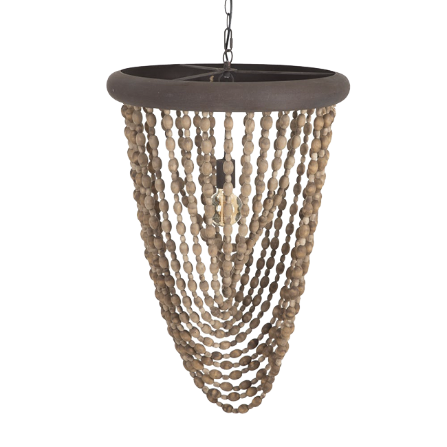 Lámpara de techo con estructura de metal efecto envejecido y montaje de perlas de madera.