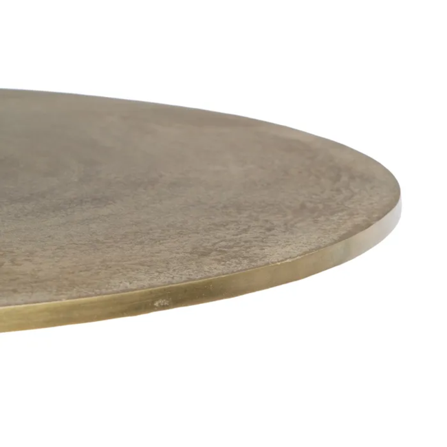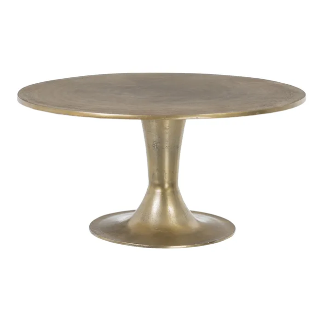 Elegante mesa de centro de aluminio terminada en color oro viejo, con pie central.