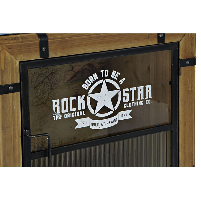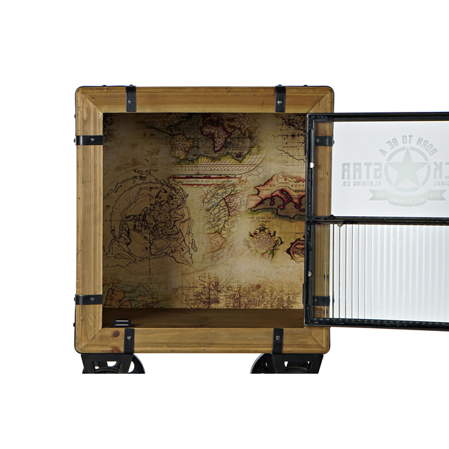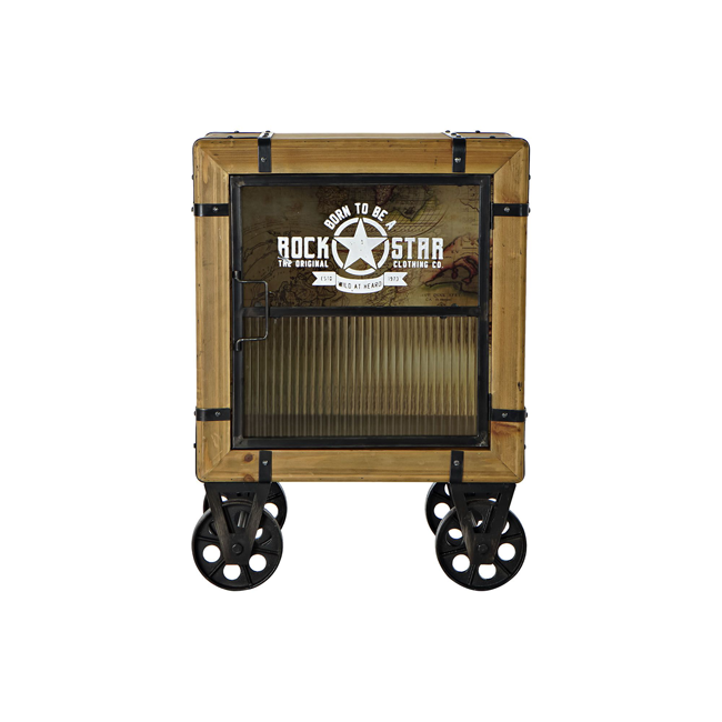 Mesita de noche estilo vintage en madera de abedul y cristal con ruedas.