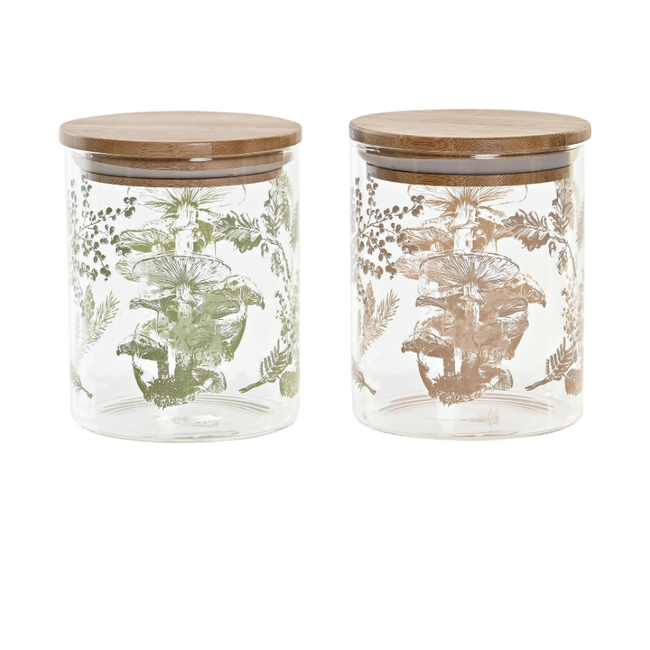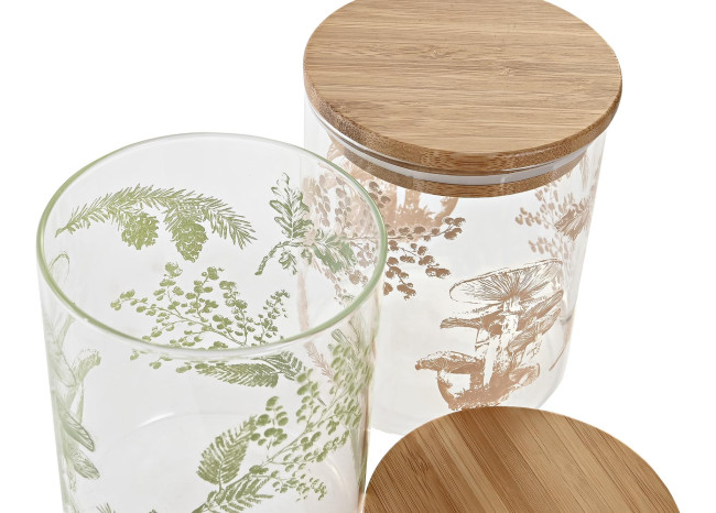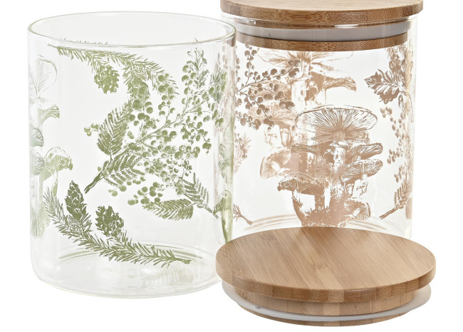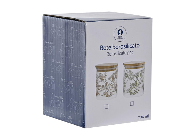 Bote de cristal borosilicato decorado en 2 colores con tapa de madera de bambú. 2 Modelos a elegir según disponibilidad.