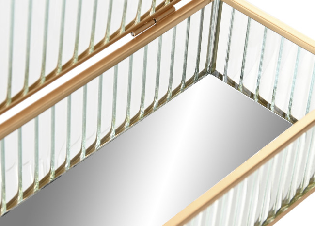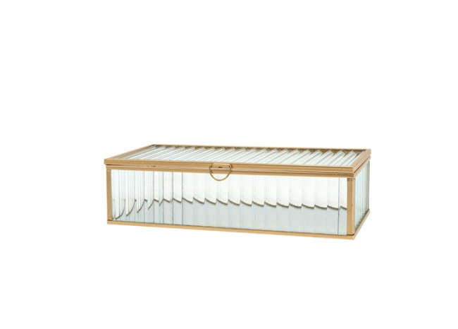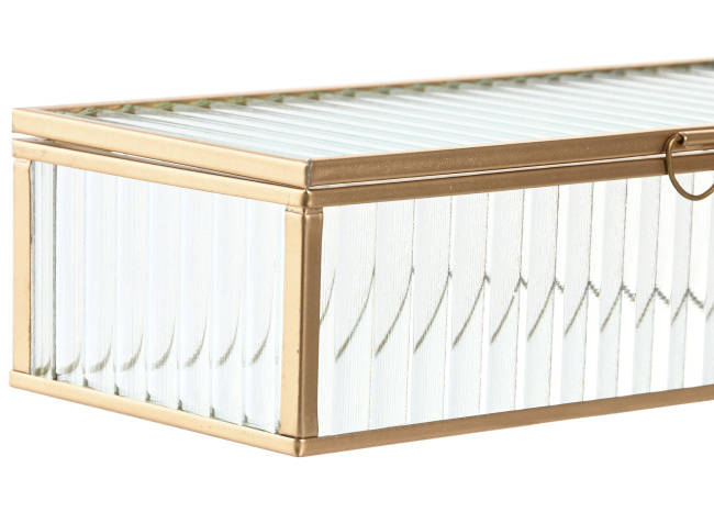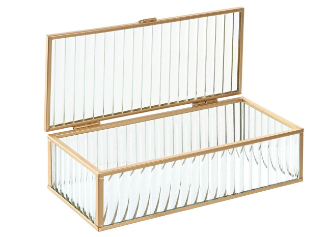 Joyero de cristal transparente ondulado con perfil metálico en oro.