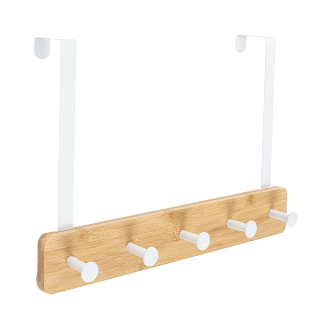 Perchero metálico para puerta en color blanco con 5 colgadores sobre fondo de madera de bambú