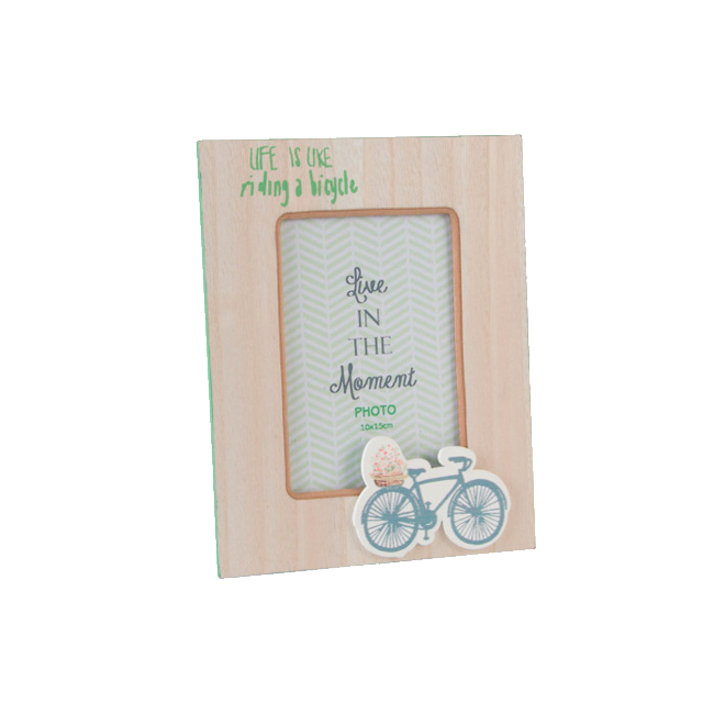 Portafotos de tonos suaves decorado con bicicleta de madera