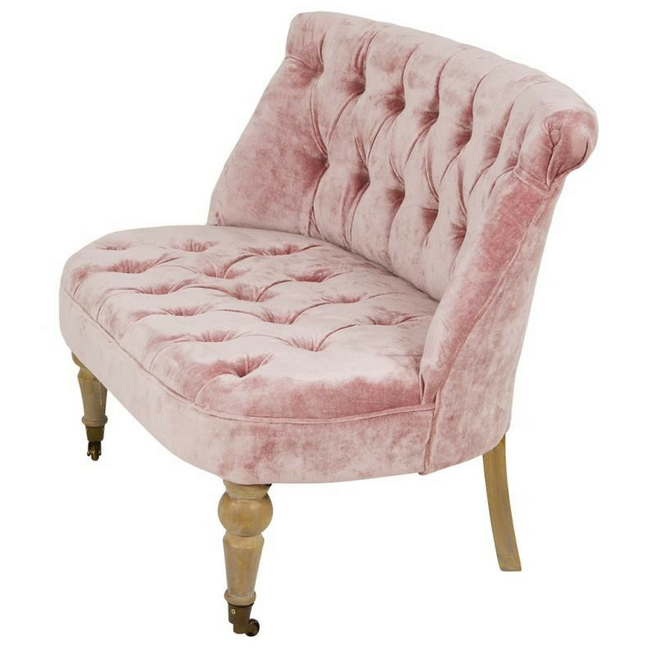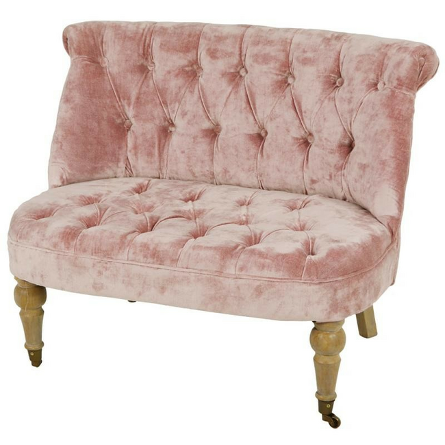 Sofacito en terciopelo color rosa, con respaldo capitoné. Su tono y su calidez en el tejido lo hacen adorable a la vez que elegante.