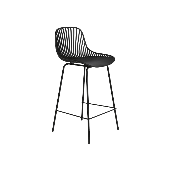 Taburete estilo scandi, de polipropileno en color negro y patas de metal en el mismo tono. Muy fáciles de limpieza