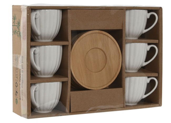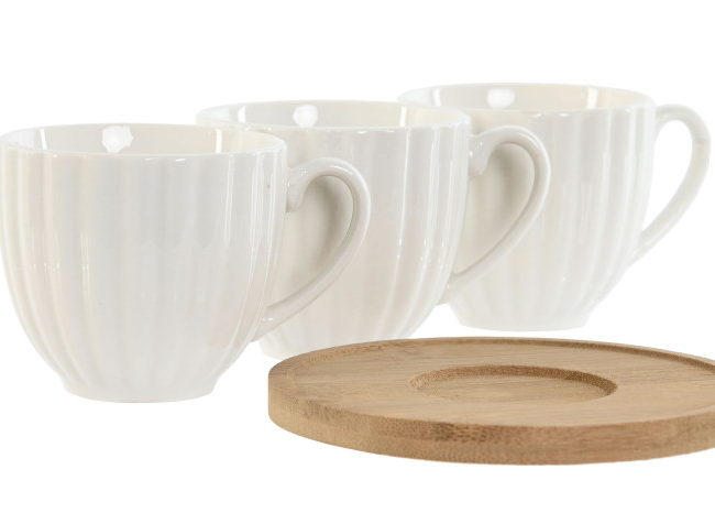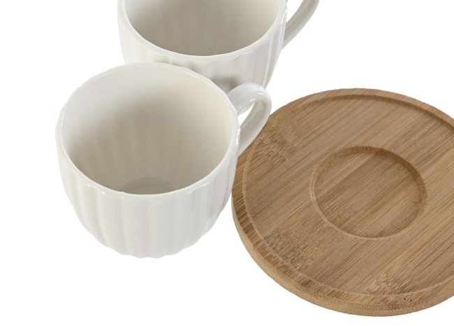 Set de café con tazas de porcelana en color blanco y platillo de madera de bambú.