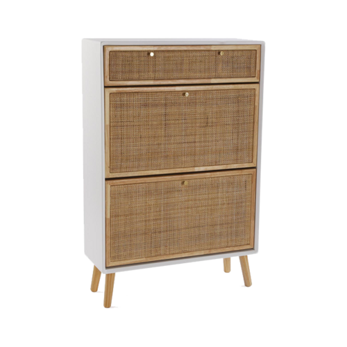 Zapatero en dm color blanco con patas y tiradores de metal dorado.