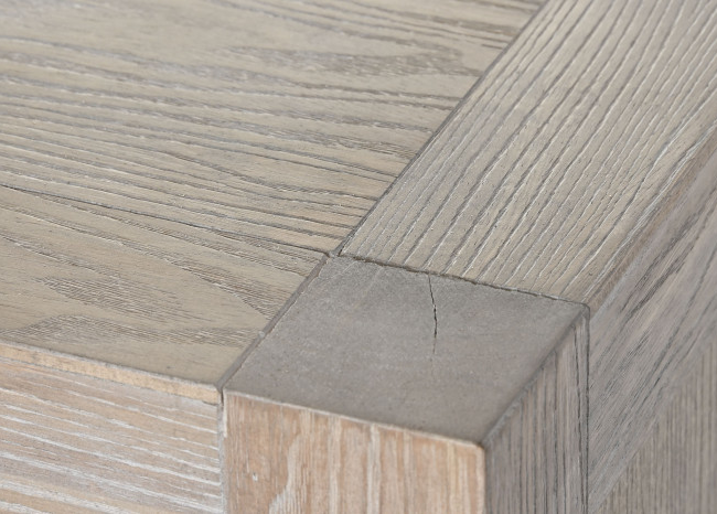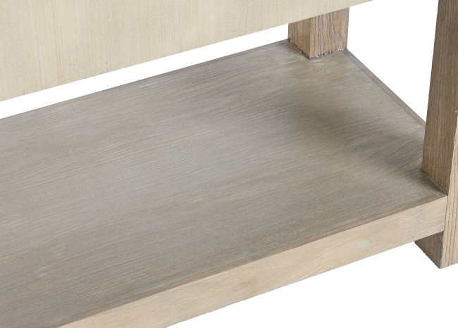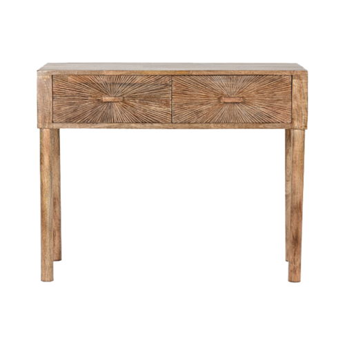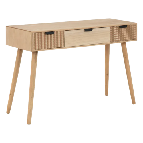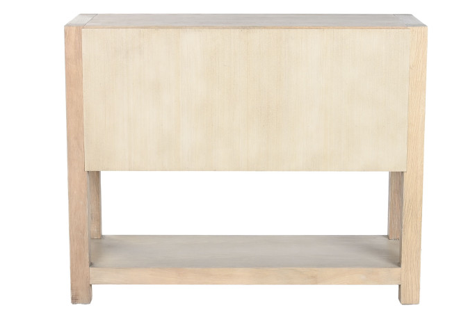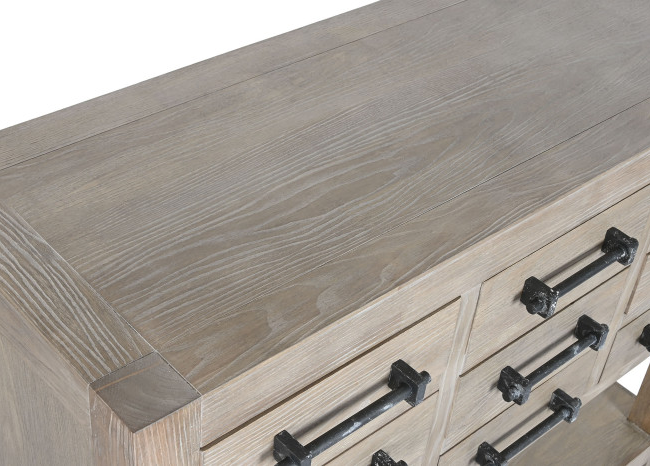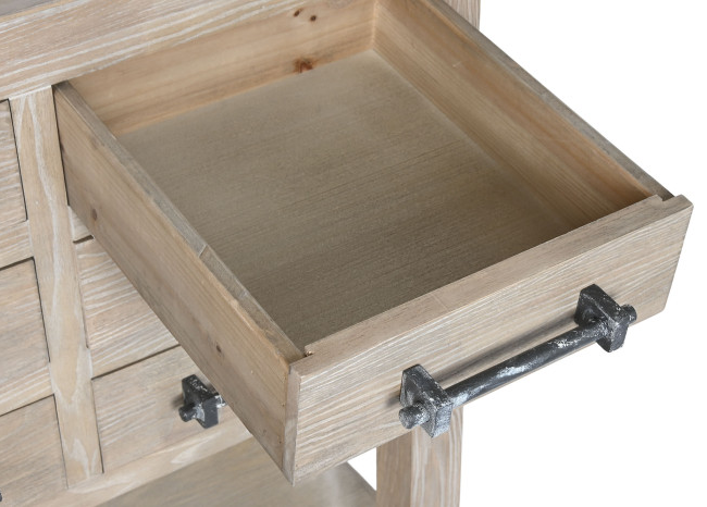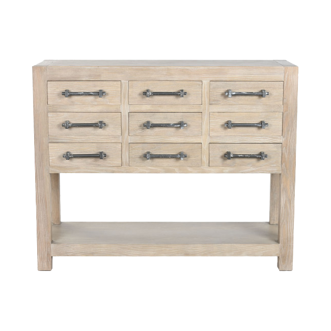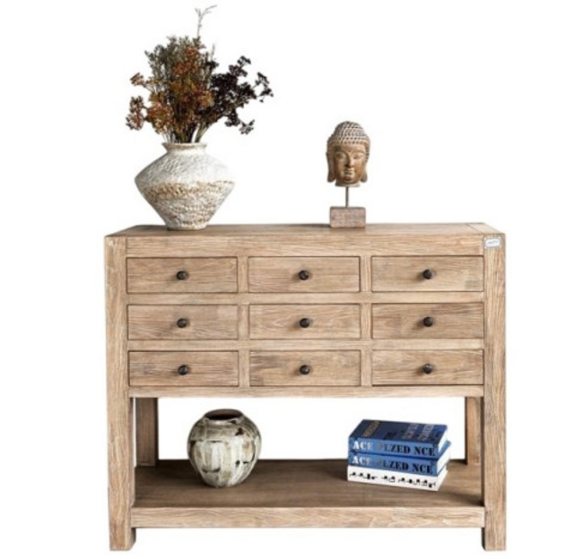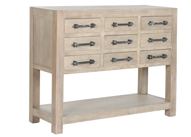 Consola de madera de hevea con 9 cajones y balda en la parte de abajo.