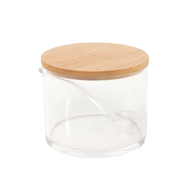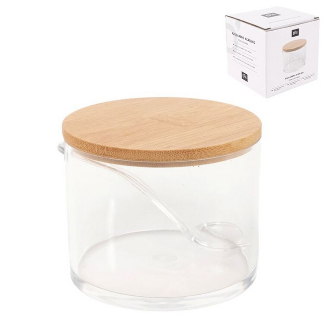 Azucarero acrílico con tapa de madera y cucharilla incluida.